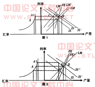 (1)人民币升值后继续实行固定汇率制同时保持资本项目不完全开放(资本管制)。如图1,如果汇率升值到a1,为了维持这个水平上的汇率不变,可以通过扩张性的财政政策使is移到is',在b点商品市场和货币市场达到均衡,产量增加,但外汇市场出现不平衡(国际收支逆差)。如果实行紧缩性的货币政策使lm移至lm'以维持固定汇率,此时国际收支出现顺差,商品和货币市场虽然达到均衡,但产量下降和通货紧缩加剧。只有当实行紧缩性的货币政策lm移到lm''(幅度比单独实行货币政策要小)和扩张性的财政政策is移到is''(幅度要小于单独实行财政政策)相配合时,在d点货币市场、商品市场和外汇市场才达到均衡,但此时的产量水平小于单独实行扩张性财政政策时的产量。