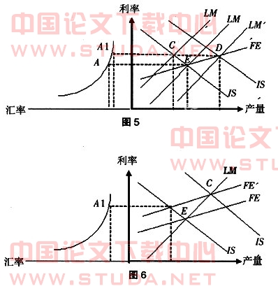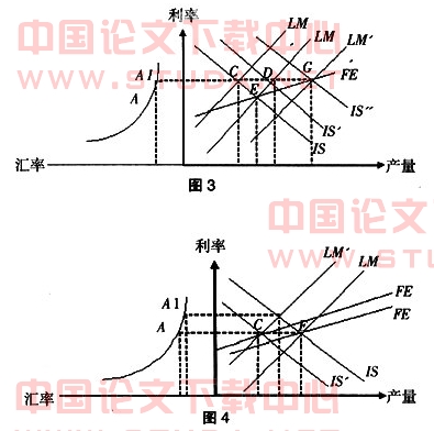 (3)维持固定汇率制再实行资本项目完全开放(资本自由兑换)。图3,如果汇率升值a1,为维持这个汇率水平不变,中央银行需要实行紧缩性的货币政策使lm移到lm',在c点,货币市场和商品市场达到均衡。利率上升和资本的自由兑换导致大量资本的流入,从而使资本金融账户出现巨大的顺差,这种顺差超过由于汇率升值带来经常账户的逆差,从而使国际收支出现顺差。在固定的汇率制度下,国际收支出现顺差使汇率有进一步升值压力。如果实行扩张性的财政政策使is移到is',在d点货币市场和商品市场达到均衡,产量上升,但国际收支逆差。只有当扩张性的财政政策和货币政策配合使用时,在g点内外经济才达到均衡并且产量将出现大副增长。
