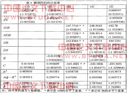 其中,ao>al,a 2...... p 7分别为常数项和回归变量系数,u为随机误差项。我们通过大量的回归结果,选择具有可解释意义的模型,模型回归估计结果如表4所示。