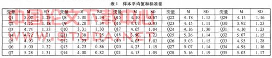 从表1可知,除了变量,q9,q10,q11,q12,q18,q30这6个变量之外,其他30个变量的平均值都比较高(介于4.03和5.26)之间。这表明员工对所有各项考察内容的同意程度是比较高的。35个变量的标准差都比较小(介于0.82和1.38之间),表明样本内部的差异程度都比较小。