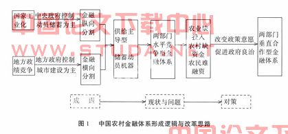 图1从“政府与市场关系”、“中央与地方关系”的角度,描述了中国农村金融发展的特殊逻辑:中国农村金融体系的建立和发展,来源于中央和地方政府动员储蓄,为工业化、城市化动员储蓄和方便政府控制的需要,而非基于解决农村融资困境的基本问题。由此,使得农村金融安排成为中央和地方政府动员储蓄的机器,资金外流、农村“失血”是这种制度安排的必然。