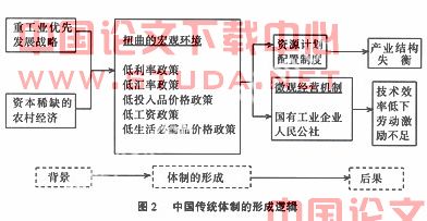 农村金融体制之所以呈现上述逻辑,与计划经济以来政治经济体制安排的宏观背景密不可分。这要从中国传统体制形成逻辑的分析中,进一步探寻其发展(见图2林毅夫等做出的分析框架)。