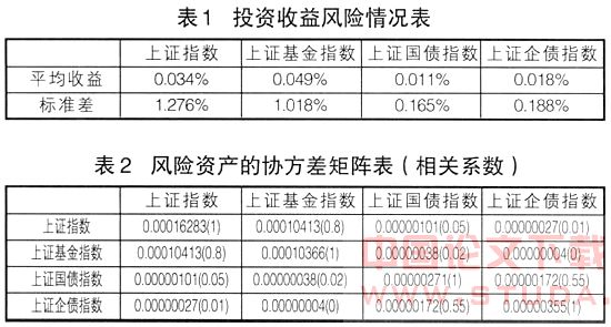 从表1中看出:风险资产的收益和风险基本匹配,但存在一定的差异。上证指数的风险最大,达到1.276%,上证国债指数的风险最小为0.165%,这也基本上反映出这四种资产真实的风险状况。风险资产的投资收益存在一定的差异,上证基金指数的收益最大为0.049%,而风险最大的上证指数的收益低于上证基金指数,这在一定程度上也反映出基金的投资盈利能力超过了市场平均水平。进行不同风险资产的投资组合是可行的。投资组合一个非常重要的前提条件就是风险资产的投资收益和风险是匹配的,只有这样投资组合才是有意义的,投资者才能根据自身对风险和收益的厌恶程度来选择不同风险资产的投资比重。