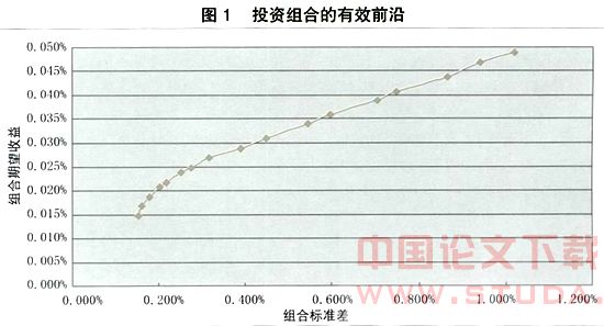 3.计算有卖空限制下的投资组合有效前沿。根据投资组合理论的均值-方差模型计算出四种指数进行组合的有效前沿(见图1),从中可以看出:投资组合的有效前沿是在一定范围内波动。组合的投资收益在0.015%~0.049%之间波动,组合标准差在0.153%~1.018%之间波动,组合投资收益的波动程度较小,而组合标准差的波动程度较大。投资组合的效果比较显著。投资组合的有效边界前沿前端比较陡峭,后面逐渐平坦,这说明投资组合在风险较小(主要表现为投资组合主要以债券为主)时,风险的微小增加能够引起投资收益的大幅上升,而在风险较大(主要表现为投资组合主要以股票和基金为主)时,风险的大幅减少只引起投资收益的微小降低。这说明通过投资组合一方面能够保证在不同风险水平下投资收益的最大化,另一方面还可以在保证投资收益的基础下大大降低投资风险。