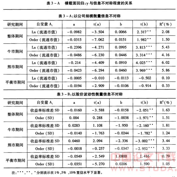 为研究叩与信息不对称程度的关系,以整个研究期以及进一步区分牛市、熊市和平衡市作为研究期间,依据公式(3)进行横截面ols回归分析,结果见表3。其中信息不对称程度采用公司规模和股价波动性两种代理变量。