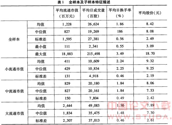 从以上描述性统计结果可以看出,我国股市不同流通市值股票的价格和成交量特征与以美国股市为代表的成熟股市具有明显差别,主要反映为整体换手率偏高,小流通市值股票的交易特别活跃等,均表现出明显的投机性特征。