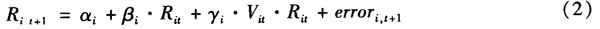 campbell等(1993)发现,股票日收益率的序列相关性主要存在于一阶关系上,二阶以上序列相关性不显著,因此,本文主要研究股票成交量与收益率一阶序列相关性的关系,即成交量对下一期收益率的预测作用,模型如下式(2)所示: