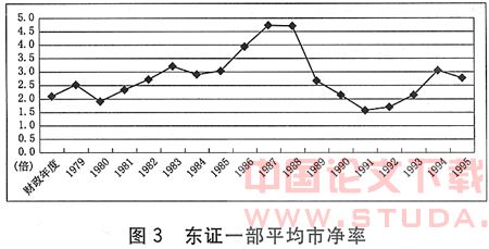 二战以后,美国股市的市净率长期在0.5-1.2之间波动,只是在90年代后半期,平均市净率才超过1.2,即便是在股市泡沫已经非常明显的2000年1季度,美国非金融类公司的平均市净率也不过2.06(转引自罗伯特·布伦纳著,王东升译:《繁荣与泡沫》p180-181经济科学出版社2003。)。日本东证一部的平均市净率(具体计算方法,以东证上市公司财政年度roe为基础,以东证一部当年平均市盈率*0.75+下一年度平均市盈率*0.25为相应的市盈率,由per*roe=pbr,计算得出市净率。)(如图3所示),据笔者测算,在股市泡沫发生之前(1979-1984年,财政年度)和经济泡沫破灭之后(1990-1996年,财政年度),分别只有2.47和2.3。而在泡沫经济发生、发展期间,市净率则从2.9持续攀升,最高达到4.7倍。在韩国,股票的市净率水平甚至更低。2005年和2006年,韩国证券交易所(krx)的
