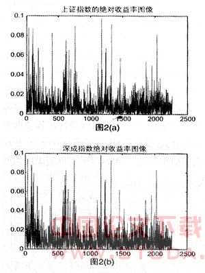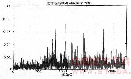 图2是上证指数、深证成指和道琼斯工业平均指数收益率绝对值的图像,其中图中的横坐标表示交易日的时刻,纵坐标表示单个交易日日收益率的绝对值,它反映了日收益率的大小。从图2的比较可以看到,在我国的两个证券指数收益率绝对值的图中,暴涨或暴跌的频率高、涨跌幅度大,再加之我国现今为止既没有做空机制也没有指数期货等套期保值工具,所以我国投资者投资股票面临的风险很大;而道琼斯指数在相同的时期里则表现的较为平缓,股市较为平稳,而且美国股市既有做空机制又有股指期货、股指基金等避险投资工具,美国投资者选择的空间大,风险相对要小的多。