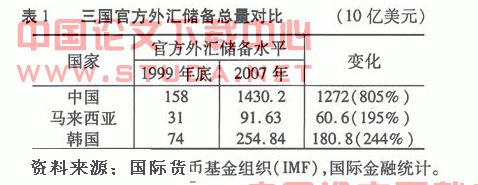 (三)外汇储备的大幅增长。亚洲金融危机以来,亚洲三国大量积累外汇储备,外汇储备的数量有较大增长。进入2007年,三国外汇储备的增幅都超过1999年水平的2倍(或接近2倍)。特别是中国,仅7年间就增长8倍以上(见表1)。