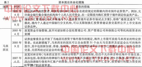 (四)逐步放开资本帐户与放宽金融管制。近年来,中国、马来西亚、韩国等都在放松对海外机构投资的限制,逐步建立政府隶属的投资公司,将国内资本疏导到国外。亚洲新兴国家对资本流出自由化采取的措施见表2。