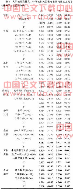 工作满意度的影响因素,不同的专业学者持不同的意见,由于研究者的背景以及目的不同,采用的视角也不同。其中颇具代表性的有refiner和zhao提出的,将影响工作满意度的因素分为两类:一类为员工特性的人口统计因素,另一类为工作环境相关因素。国内专家学者也根据类似方法展开了对各类企业、各类员工工作满意度影响因素的研究。本研究通过考察各人口统计变量和工作环境相关因素在各方面的得分是否存在显著差异来进行间接的验证。统计分析结果显示:年龄、工作年限、婚姻状况、企业规模及企业类型对工作满意度的不同维度存在一定的影响。人口统计变量及工作环境相关因素在各结构维度上的差异分析汇总表和平均得分及t检验明细表见表么表3}