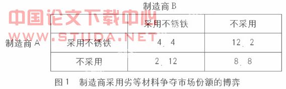 以两个不锈钢产品制造商为例建立博弈模型,争夺市场份额的主要策略是采用不锈铁取代不锈钢,间接地降价。假定双方都不采用不锈铁替代时利润各是8万元;很显然,假定其他制造商不采用不锈铁作为替代材料,而自己采用,即间接地降低自己的产品成本则必能多得利润,假定是12万元,这时其他制造部优的利润将减少,假定是2万元(市场总利润比双方都不采用时少);而如果双方都采用不锈铁作为替代材料,则每个制造商的利润都将减少,但比别人采用而自己不采用时会好,假定各是4万元。该博弈唯一的纳什均衡是(采用,采用),相应的支付向量是(4,4),而能给双方都带来8万元利润的策略组合(不采用,不采用)却不是一个稳定的结果。即这两个制造商走进了我们常说的“囚徒困境”,未达到帕累托最优状态,有改进的余地。