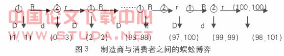 假定字母“d”和“r”都是制造商“采用不锈铁”和“不采用不锈铁”的策略,而字母“d”和“r”是消费者“买”和“不买”这些不锈铁产品的策略。显然,上述博弈是两个博弈方这间的完全且完美信息的动态博弈,我们可以用逆推归纳法进行分析。首先看博弈最后一个阶段博弈方2(即消费者)的选择,因为消费者在进行权衡时,往往更多地考虑切身的近期利益,买不锈铁产品要便宜,所以选择买的得益101﹥100,即d是他的最佳选择。同理再逆推到第二个阶段博弈方1(即制造商)的选择,因为制造商同样为了短期利益,采用劣不锈铁取代不锈钢降低成本进而间接地降低价格,因此对于制造商而言,选择采用不锈铁的得益99﹥98,即d是他的最佳选择。以此类推,我们一直可逆推到博弈方1在第一个阶段就会选择d(即“采用不锈铁”),直接结束博弈,双方得益都为1。即理论上所推出来的均衡结果应是制造商选择“采用不锈铁”的策略,消费者选择“买”的策略,均衡路径为“d-d-d-d-d……”。从个体理性出发的最优选择最终会导致极差结果的问题。