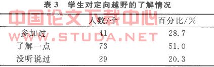 从表3中可以看出只有28.7%的学生参加过定向运动,绝大多数学生没有参加过,但通过表4可以看出他们对该运动的价值有着比较全面的认识,学生认为定向运动有利于培养和激发体育运动的兴趣增长专业体育知识;有利于锻炼身体、发展体能、促进健康;有利于提高学生的创造性、主动性、独立性及野外生存能力;还可以培养团队精神,增强整体意识.从表2得知有32.1%的学生愿意参加定向运动.这对在我校开展定向越野提供了依据.