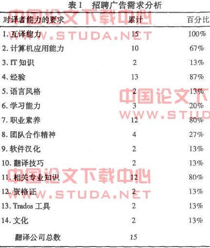 招聘广告是反映翻译市场需求的个窗口。为了分析用人单位对翻译人才的要求,笔者通过网络信息,随机搜集了东方翻译中心、北京奥莱克(aluike)翻译公司、山东东营信意达翻译咨询有限公司、lingochina、厦门精艺达翻译服务有限公司、北京思必锐翻译有限责任公司、北京天和汇佳翻译有限公司、福建省翻译工作者协会、深圳市飞蓝翻译有限公司、济南市双泽翻译咨询有限公司、纬度翻译有限责任公司、中兴通讯、长沙青铜翻译咨询有限公司、无锡市翻译协会、国际翻译网等15个翻译公司对翻译人才的能力要求和任职资格的文字描述。其中囊括了对高级译审、质量控制总监、翻译项目经理与高级翻译等职位的任职资格和能力要求,翻译人才需求领域涉及一般翻译、科技英语翻译、文件翻译、专利翻译等普通和实用领域。文字描述详细而具体,却无法进行统计。因此,本文采用内容分解法,把每一个翻译公司的要求按照能力进行分类,分解为双语互译能力、计算机应用能力、iri'知识、翻译经验、语言风格、学习能力、职业素养、团队合作精神、软件汉化、翻译技巧、相关专业知识、翻译资格证、trados等翻译工具以及文化知识等14类。然后,对15个公司中相应的能力要求进行统计。例如。强调计算机应用能力的公司有l0个.看重职业素养的公司有12个。最后,统计结束后,再计算出它们各占公司总数的比例(见表1)。