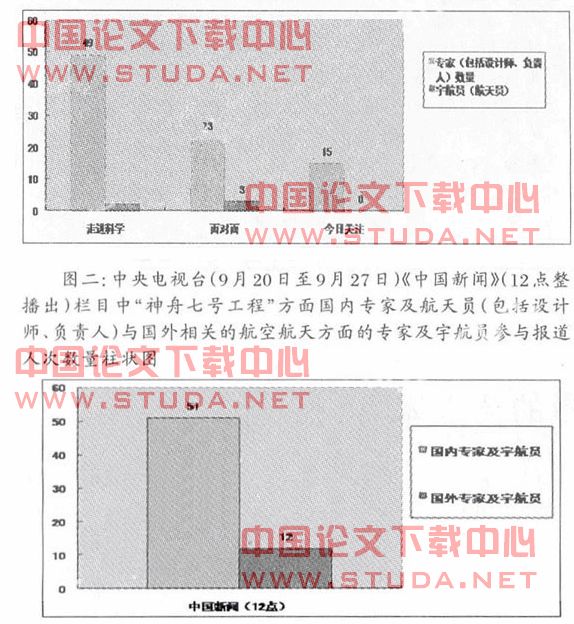 1、神舟七号飞船工程的主要负责人、相关系统的设计者及宇航员成为报道的主角。据笔者初步统计,《面对面》、《今日关注》、《走近科学》及《中国新闻》(12点)栏目中“神舟七号工程”方面专家(包括设计师、负责人)及宇航员参与报道人次数量累计达到155以上如图一、二,专家的采访报道的主要有以下几种形式:早期的现场报道采访、视频连线现场采访、演播室访谈、早期访谈等。如图二“作为新闻频道惟一的长篇人物访谈类节目。《面对面》栏目在神七报道中发挥自身节目特色和优势,以神七发射任务中的高端人物——航天员、七大系统总指挥、我国载人航天工程领军人物为采访对象,由主持人董倩面对面作深度人物访谈,揭秘鲜为人知的幕后故事,讲述航天人在备战神七过程中酸甜苦辣的人生经历。在发射之前,《面对面》栏目就独家专访了三位航天员:翟志刚、刘伯明、景海鹏,近距离深入地采访,讲述他们的种种经历,人生感受,这在国内媒体仅此一家。”而中央电视台四套的《今日关注》栏目作了7期与“神舟七号载人航天飞行”有关的特别节目,每期节目演播室邀请两位相关的专家,就事态进展穿插相关新闻背景展开话题讨论,播出时间分别在“神七发前”和“神七宇航员安全返回地面”两个时间段。《走近科学》栏目作了9期与“神七”相关的特别节目,重点在于通过报道普及相关的航空航天知识。中央电视台四套12点整播出的《中国新闻》从9月20日到9月29日每天都有15——25分钟与神舟七号相关的新闻资讯。同时在9月20日至9月24目播出的报道中贴上了“期待神七”的显著标签,国内专家及宇航员的采访形式比较多,每期都有直播的现场采访,而关于国外的专家及宇航员的采访大多是早期记者采访的报道,就报道的主要内容而言大部分专家在“神七发射前后”给予热情的祝贺与积极的评价肯定,采访的宇航员主要是有过太空经历的以及产生过重大影响的宇航员。国外的航天专家及宇航员从国家分布来看主要有美国、俄罗斯、巴西、印度等。