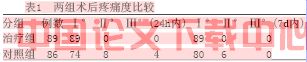 根据国家中医药管理局1994年发布的《中医病症诊断疗效标准》评定肛裂的疗效,按1975年全国中西医结合防治肛肠病经验交流所定的术后疼痛分度进行对比,治疗组术后疼痛、出血、愈合时间明显优于对照组(p<0.05),两组术后疼痛度比较见表1。两组未出现术后大出血,均为手纸带血。治疗组13例尿潴留行保留导尿。气体失禁8例,液体失禁2例。对照组11例尿潴留行保留导尿。气体失禁7例,液体失禁3例。两组患者症状均术后7天内消失,无显著性差异,无创面感染、肛门狭窄及肛门畸形、肛门坠胀等并发症。术后随访0.5~10年,治疗组随访78例,信访11例。对照组随访69例,信访17例。175例患者全部愈合,治愈率达100%,无复发和合并症及后遗症。