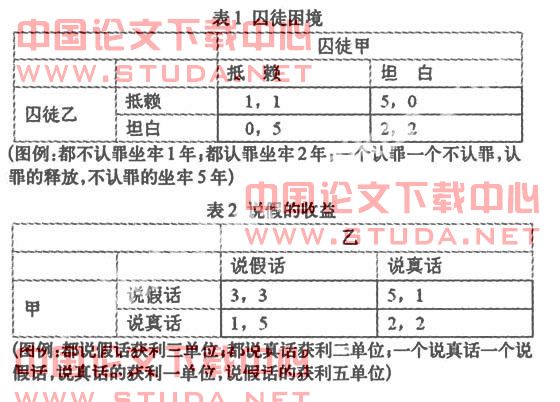 如果不存在严厉的惩罚和严密、规范的制度的话,作为局中人,甲进行策略选择时,如果乙说真话,则甲说假话比说真话多获利3单位;如果乙说假话,则甲说假话比说真话多获利2个单位。无论局中人乙选择何种策略,局中人甲说假话都比说真话获利大,因此从个人理性出发,甲必然选择说假话。同理,乙的选择也是如此。结果大家都倾向于说假话,于是弄虚作假在社会上盛行。显然这种策略的选择不利于整个社会的发展,个人理性与集体公平、公正的准则发生了矛盾,出现了前面所说的“囚徒悖论”。那么现实中个人理性与集体理性是否真的不相容?个人利益的增加必须以集体利益或他人利益的损失为代价呢?解决问题心症结还必须从“囚徒悖论”模型的条件入手。实际上,在该模型中,如果改变法院的判决规则为:若两个囚犯都不承认,则各判处2年徒刑;若两个罪犯都坦白,则各判罚6个月监禁(一个坦白,一个抗拒的判罚情况不变),那么两个囚犯从个人理性出发,仍然都会选择“坦白”的策略,但此时“悖论”并不存在。因此,“悖论”存在的原因在于“判决规则不合理”,其本身存在悖论(不坦白判罚轻,坦白了反而判罚重),而不是对策导致悖论。可见,在博弈格局中,博弈规则的制定是至关重要的,它的好坏直接影响着局中人的策略选择。所谓的博弈失败,究其根源,与制度的设置有关。走出“囚徒困境”,寻求个人理性与集体理性的统一的关键在于制度的完善。具体到语言交际中说假话的问题,这是在一定的博弈规则下做出的选择,片面地否定利益主体追求自身收益最大化的行为动机,对他们选择说假话的最优策略严加指责并不是解决问题的根本办法;制度本身的不合理是问题的症结所在。如果改变并完善制度设置,使说真话的主体比说假话的主体所获利益多得多,多说真话的主体所获得的利益要大于少说真话的主体所获得的利益,同时使说假话的主体不一定获得高收益并承担高风险,则博弈的结果必然以(说真话,说真话)为最优策略集。故在人们的语言交际中,是否存在一个严密、规范的奖惩制度是解决人与人之间“说谎”或“不诚信”问题关键。这种制度安排可以是健全的法律体系,高效率的执法部门规范、完整的规章制度,行之有效的道德约束。